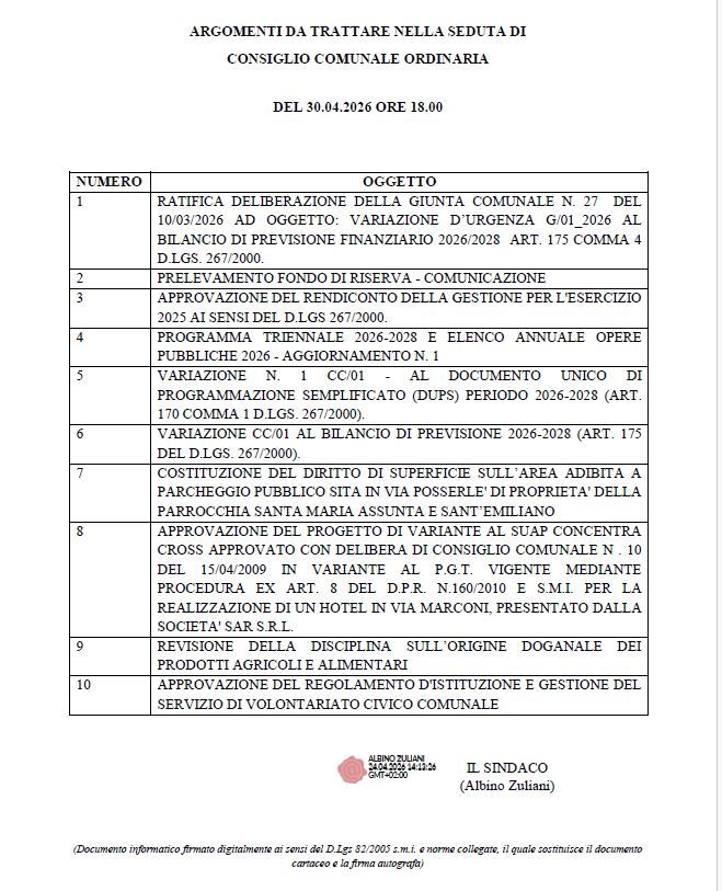 E' convocato il Consiglio Comunale in seduta ordinaria il giorno giovedì, 30 aprile 2026 alle ore 18.00